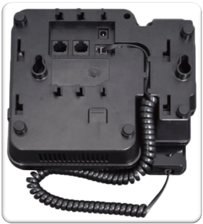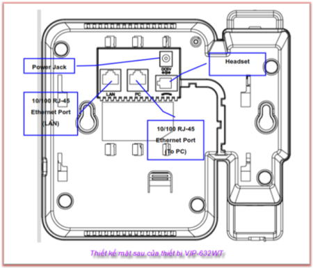 Mặt sau của thiết bị có một cổng LAN để bạn có thể kết nối với các thiết bị mạng như router, switch hoặc kết nối Internet. Một cổng PC giao diện RJ-45 để kết nối trực tiếp với máy tính. Bên cạnh đó còn có một cổng RJ-11 để kết nối điện thoại với ống nghe (hay tay cầm). Phía trên là cổng cắm nguồn để cấp nguồn cho thiết bị với điện áp vào sử dụng là 5V DC.