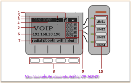4) Các phím chức năng chương trình (Soft Key): Những phím này cho phép bạn lựa chọn các mục hay để điều khiển trên màn hình LCD, gồm có redial, phonebook, wifi, dnd.