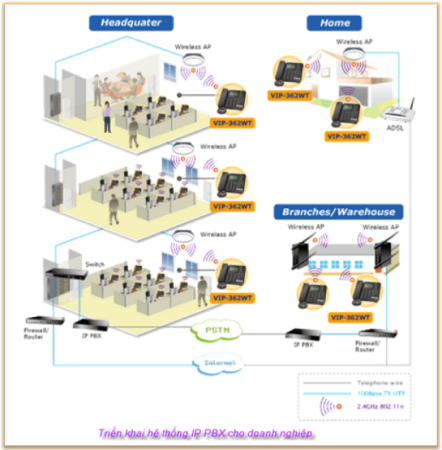 Các văn phòng công ty được lắp đặt với thiết bị Wireless Access Point (điểm truy cập không dây) có thể áp dụng VIP-362WT để làm việc trong môi trường phục vụ cho truyền thông thoại. Chỉ viêc cắm vào và nói chuyện, nhân viên di động có thể thực hiện bất kỳ cuộc gọi nào trong văn phòng, nhà kho hay nhà máy. Hoạt động cùng với Access Point của Planet là AP treo trần hỗ trợ 802.11n (model: WNAP-C3220) và IP PBX/Firewall Gateway (Unifited Office Gateway model: UMG-2000 family), sản phẩm VIP-362WT xây dựng hệ thống thông tin liên lạc an toàn cho các doanh nghiệp.