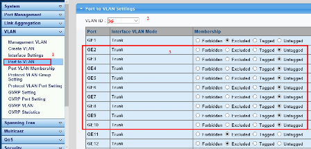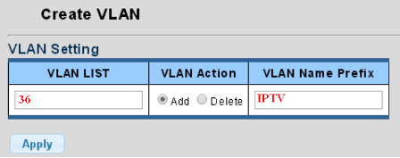 Ví dụ: trên hình minh họa, cần cấu hình VLAN ID 36 cho dịch vụ IPTV từ cổng 2 đến cổng 10 lựa chọn PVID 36 trong lựa chọn VLAN ID. Sử dụng chế độ Untagged cho các cổng này trong lựa chọn Membership