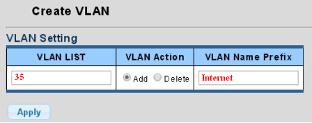 Nhập thông tin ID VLAN vào mục VLAN List, Chọn chế độ ADD trong VLAN Action, điền tên trong VLAN Name Prefix