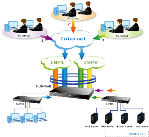 Hơn thế nữa, MH-3400 cho phép thực hiện tính năng cân bằng tải tren 3 – 4 kết nối WAN. Trong chế độ cần bằng tải vùng outbout các phiên làm việc được chỉ định dựa trên chế độ cấu hình cân bằng tải, như AUTO Load balance, Unbinding WAN Balance và Strategy Routing. Người sử dụng có thể cấu hình IP hoặc TCP/UDP cho kết nối cổng WAN. Tính năng cân bằng tải vùng Inbound dành cho hệ thống máy chủ. Tính năng cân bằng tải trong vùng này giúp giảm nguy cơ rủi ro hệ thống cải thiện hiệu quả hệ thống mạng