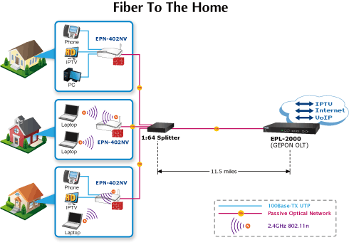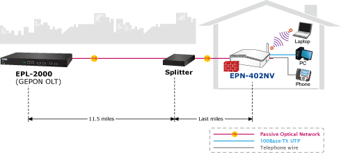 EPN-402V là một thiết bị truy cập băng rộng thông qua cáp quang. Nhờ tích hợp giao diện quang 1.25 Gbps GEPON, EPN-402V hỗ trợ nhiều kết nối quang khác nhau cho khoảng cách kết nối lên tới 20km thông qua kết nối cáp quang. Thiết bị đáp ứng cho nhiều ứng dụng dịch vụ như IPTV, chơi game trực tuyến, VoIP và đáp ứng băng thông sử dụng mượt mà với tính năng QoS. Vì thế thiết bị rất thuận lợi với độ tin cậy cao và ổn định. EPN-402NV có thể ứng dụng cho mạng SOHO hoặc doanh nghiệp nhỏ với hiệu suất cao