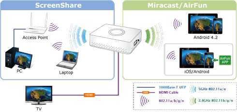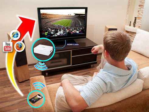 WTV-3000 hỗ trợ chứng chỉ WiFi tiêu chuẩn Miracast và Intel WiDi có thể đơn giản hóa việc tìm kiếm các thiết bị kết nối và thiết lập cho phép dễ dàng truyền nội dung từ máy tính xách tay/ máy tinh bảng/ điện thoại thông minh lên TV