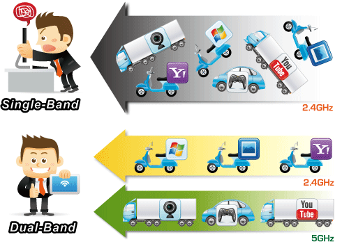 Ngày càng có rất nhiều các ứng dụng không dây và các thiêt bị điện tử sử dụng dải tần 2.4 GHz và các kênh phát của dải tần 2.4 GHz đã quá nhiều người dùng truy cập và thưởng thức kết nối không dây tốc độ cao. Để tránh trường hợp nhiễu sóng lẫn nhau, WTV-3000 hỗ trơ thêm dải tần 5GHz thưởng thức các video chất lượng HD hoặc trò chơi trực tuyến. Đồng thời, thiết bị cho phép người dùng khác lướt web, Internet thông qua dải tần 2.4GHz