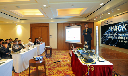 Anh Đỗ Anh Minh-Phó Giám đôc Công nghệ công ty NETCOM trình diễn các kịch bản phòng chống tấn công Vật lý và Nghe lén ăn cắp dữ liệu sử dụng giải pháp của HanDreamnet kết hợp với TrendMicro tại Hà nội